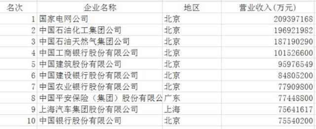 ? ? ? ? 2017中國企業(yè)500強(qiáng)的營業(yè)收入總額首次突破60萬億元,達(dá)到了64.00萬億元,相當(dāng)于去年我國GDP總額的86%。榜單上,營業(yè)收入超過1000億元的共有157家,較上年增加5家,繼續(xù)擴(kuò)容。其中,國家電網(wǎng)公司成為中國唯一營業(yè)收入超過2萬億元的企業(yè),僅次于美國沃爾瑪,是世界第二大企業(yè)。