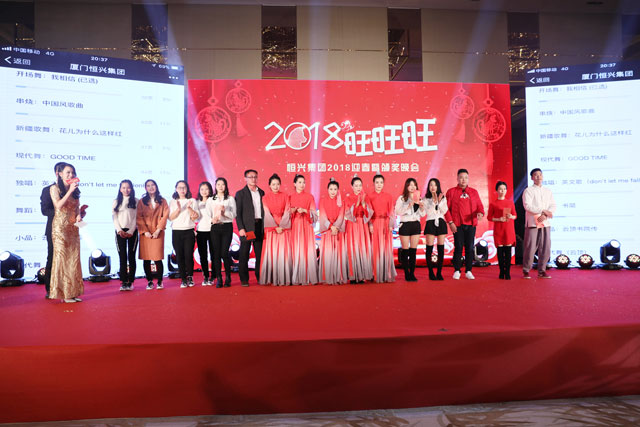 ? ? ? ? 節(jié)目表演之間還穿插鼓舞人心的《2017輝煌業(yè)績》視頻播放,溫馨難忘的《2017我們在一起》照片回顧,以及激動人心的幸運(yùn)大抽獎環(huán)節(jié),掀起現(xiàn)場一波又一波的小高潮。隨后,王偉文總裁攜恒興集團(tuán)中層領(lǐng)導(dǎo)獻(xiàn)唱恒興之歌《永恒的星座》,大家熱血沸騰、團(tuán)結(jié)一心、齊聲合唱,讓整場晚會然若演唱會現(xiàn)場,熱鬧非凡。
