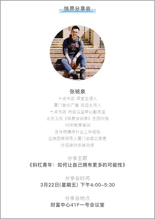 由我們公司的四位高管和四位特邀嘉賓為大家?guī)韺n}分享會,分享他們的成長故事或是學(xué)習(xí)工作經(jīng)驗(yàn)等。