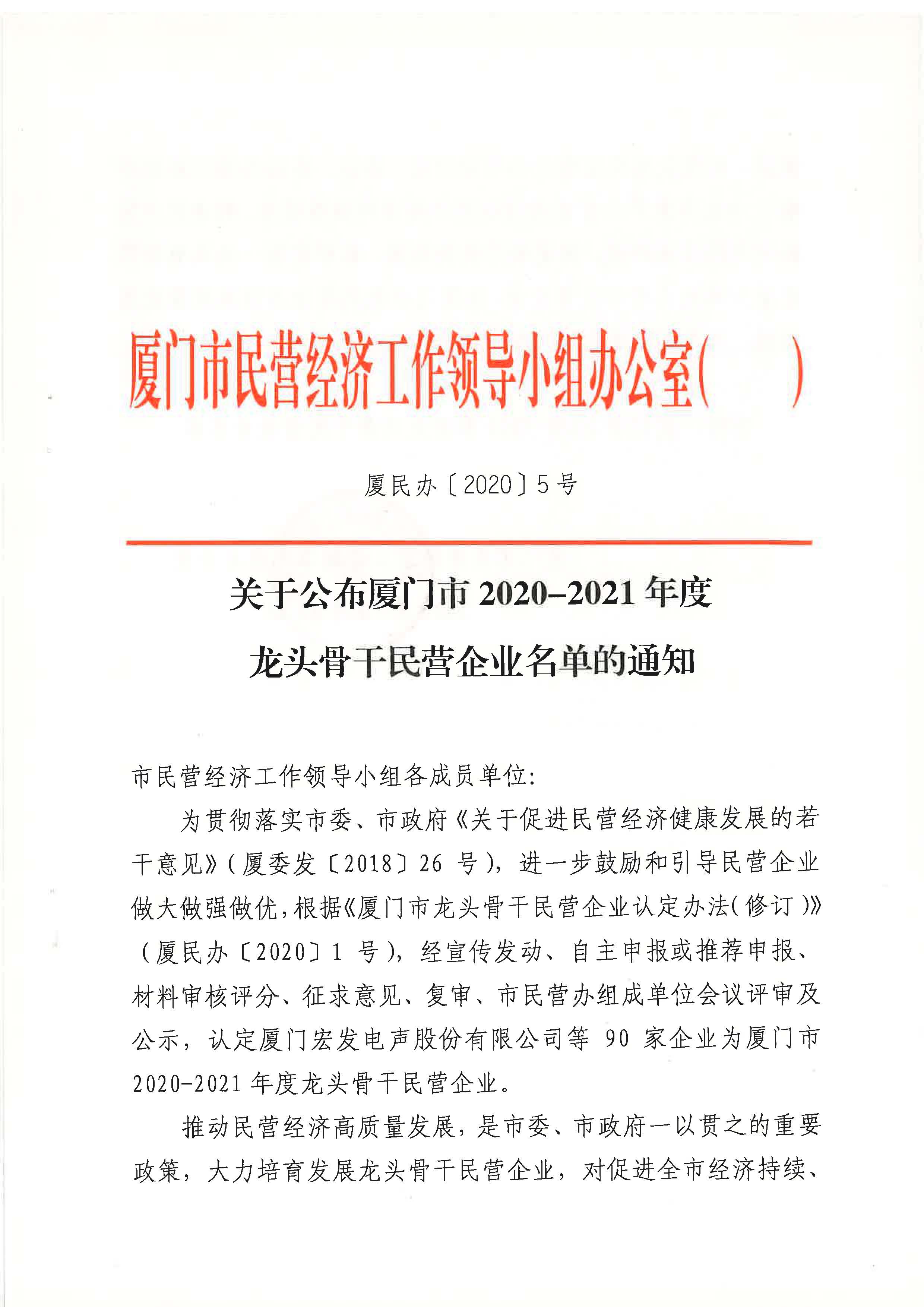 ? ? 為貫徹落實市委、市政府《關(guān)于促進民營經(jīng)濟健康發(fā)展的若干意見》(廈委發(fā)[2018]26號),進一步鼓勵和引導民營企業(yè)做大做強做優(yōu),根據(jù)《廈門市龍頭骨干民營企業(yè)認定辦法(修訂)》(廈民辦[2020]1號),經(jīng)宣傳發(fā)動、自主申報或推薦申報、材料審核評分、征求意見、復審、市民營辦組成單位會議評審及公示,認定廈門宏發(fā)電聲股份有限公司等90家企業(yè)為廈門市2020-2021年度龍頭骨干民營企業(yè)。