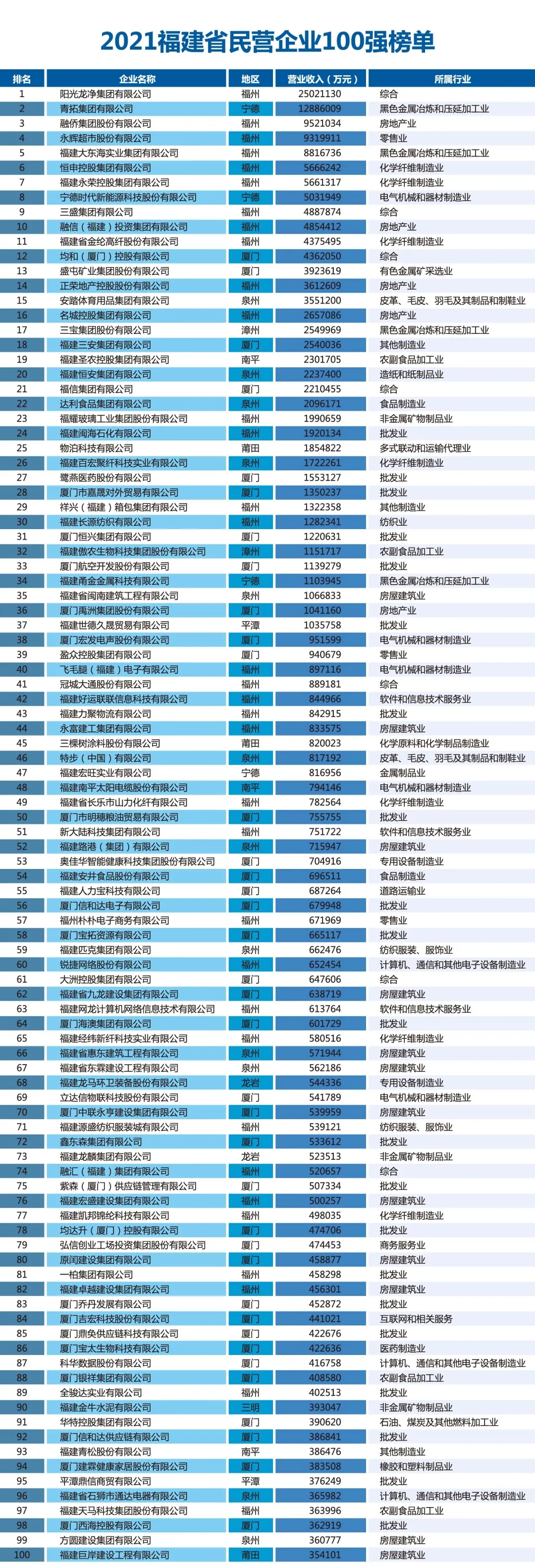 會上,省委統(tǒng)戰(zhàn)部副部長、省工商聯(lián)黨組書記李家榮代表省工商聯(lián)發(fā)布了“2021福建省民營企業(yè)100強(qiáng)”“2021福建省創(chuàng)新型民營企業(yè)100強(qiáng)”“2021福建省民營企業(yè)制造業(yè)50強(qiáng)”榜單?!?021福建省民營企業(yè)100強(qiáng)”中,廈門恒興集團(tuán)有限公司位列第31位,廈門寶拓資源有限公司位列第58位。