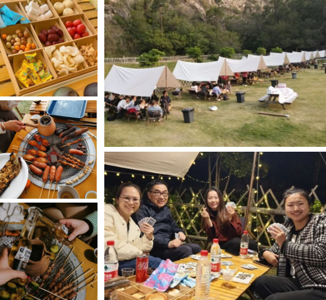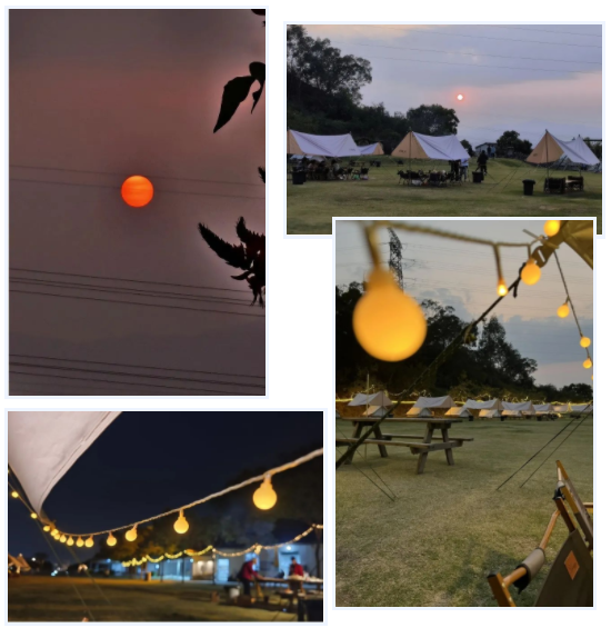 相聚的時(shí)刻,從來不缺少美食,17:30,燒烤晚餐開啟。令人驚喜的是,整片營地向西,一眼望去,夕陽正西下,我們一起遇見了這個(gè)春天震撼的落日景色。星星點(diǎn)點(diǎn),斑駁光影照在天幕下,美食美酒伴圍繞,聽著小伙伴們述說各自精彩有趣的經(jīng)歷過往。雖然時(shí)不時(shí),還要接個(gè)工作電話,但是當(dāng)下,我們在一起,就是最值得開心的。