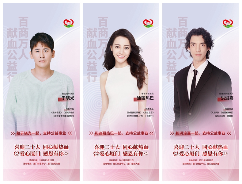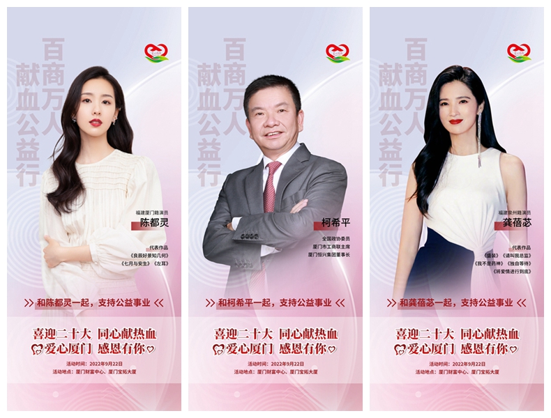 【廈門晚報(bào)】9月22日,由市工商聯(lián)(總商會(huì))發(fā)起,并聯(lián)合廈門市中心血站、廈門恒興集團(tuán)主辦的“百商萬(wàn)人獻(xiàn)血公益行”活動(dòng),將在廈門財(cái)富中心和寶拓大廈同時(shí)舉辦。近日,迪麗熱巴、陳都靈、龔蓓苾、洪浚嘉、于曉光等影視演員紛紛為廈門這一公益活動(dòng)發(fā)聲,拍攝視頻送上祝福,傳遞“愛(ài)心廈門 感恩有你”的正能量,號(hào)召愛(ài)心志愿者們助力廈門無(wú)償獻(xiàn)血公益事業(yè)。