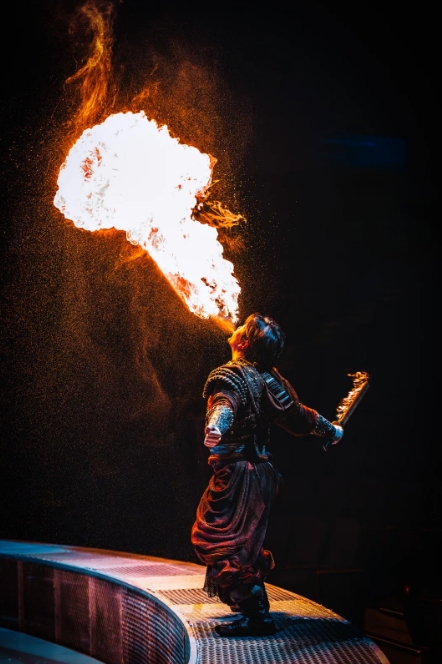 “本次升級,我們采用“天幕地屏+激光投影”的立體舞臺設(shè)計,打破了傳統(tǒng)演出的空間限制,給觀眾帶來前所未有的沉浸式體驗。”導(dǎo)演閔銳接受采訪時說,“《王的戰(zhàn)車》以北方部落的古老傳說為藍(lán)本,將傳統(tǒng)技藝與現(xiàn)代科技巧妙融合。比如縵吊演員的表演象征著部落信仰的升華,而噴火表演則象征著勇士的熾熱斗志。整場演出既保留了傳統(tǒng)雜技的力量與驚險,又通過全息投影技術(shù)等科技手段賦予其全新的藝術(shù)表達(dá),希望觀眾在觀演的過程中,除了感受到震撼,也能體會到中國傳統(tǒng)文化的深厚底蘊與傳承。